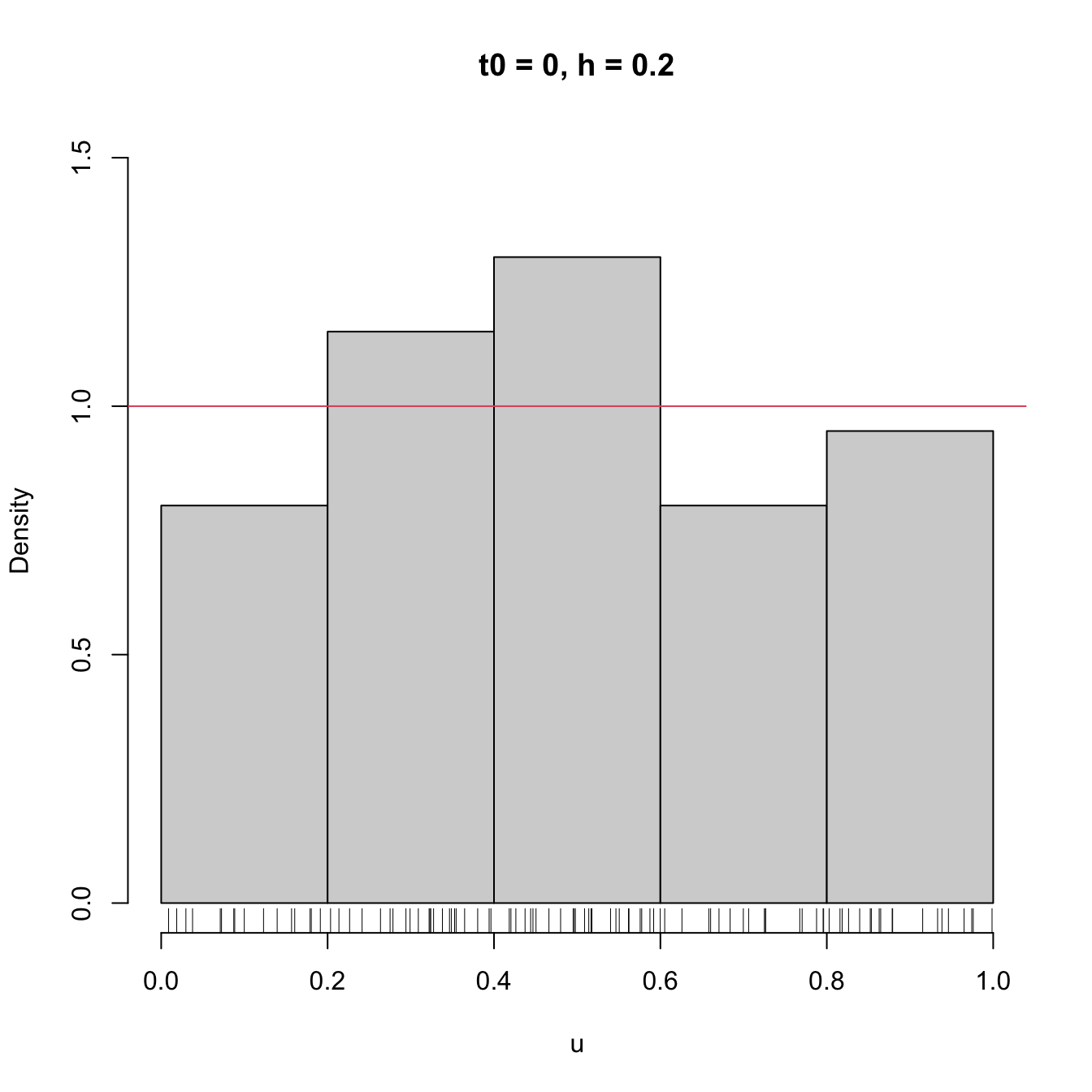 hist(u, probability = TRUE, breaks = Bk1, ylim = c(0, 1.5),