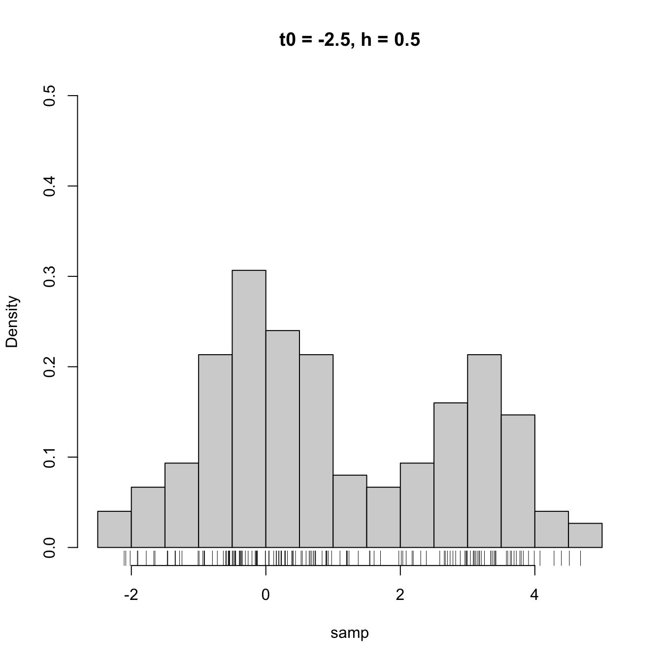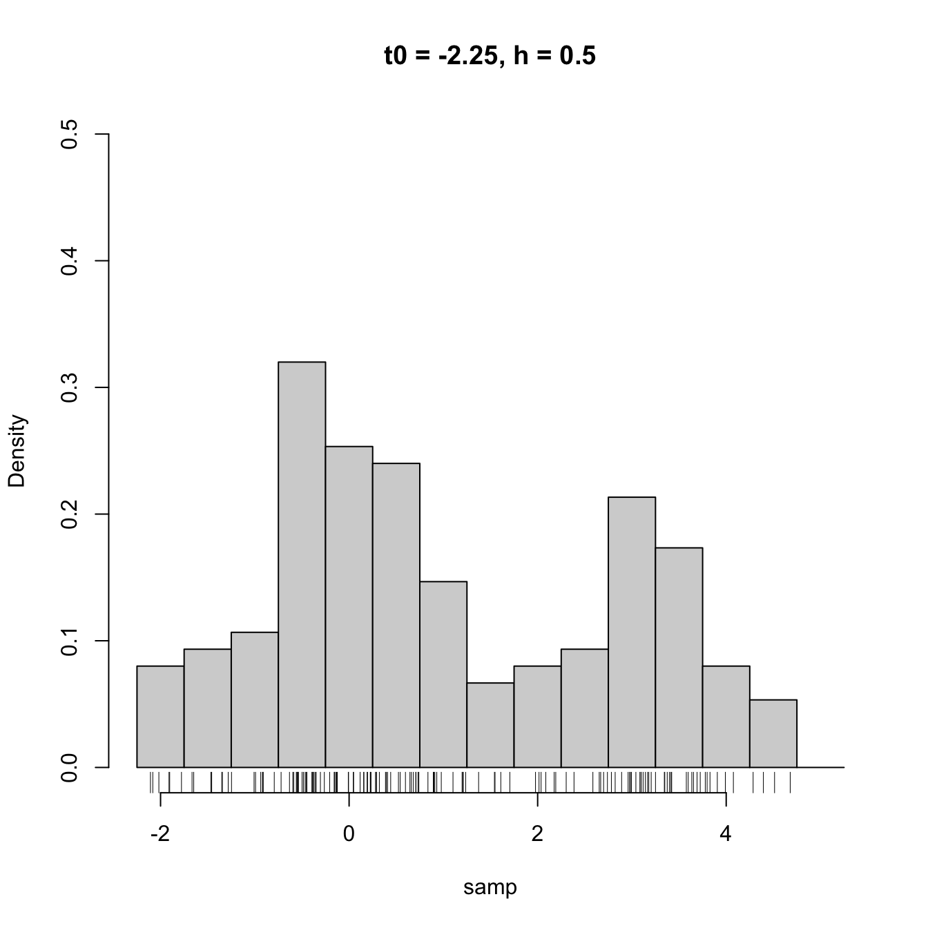 An alternative to avoid the dependence on \(t_0\) is the moving histogram or naive density estimator. The idea is to aggregate the sample \(X_1,\ldots,X_n\) in intervals of the form \((x-h, x+h)\) and then use its relative frequency in \((x-h,x+h)\) to approximate the density at \(x\):