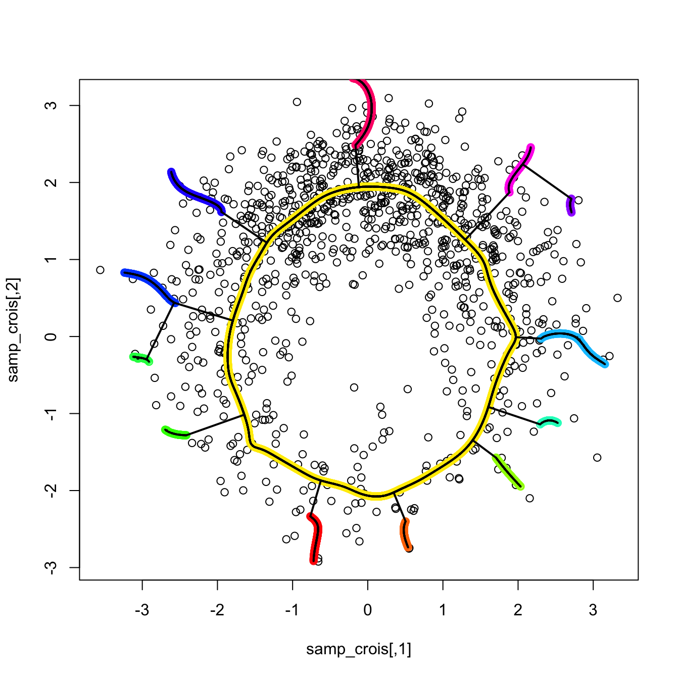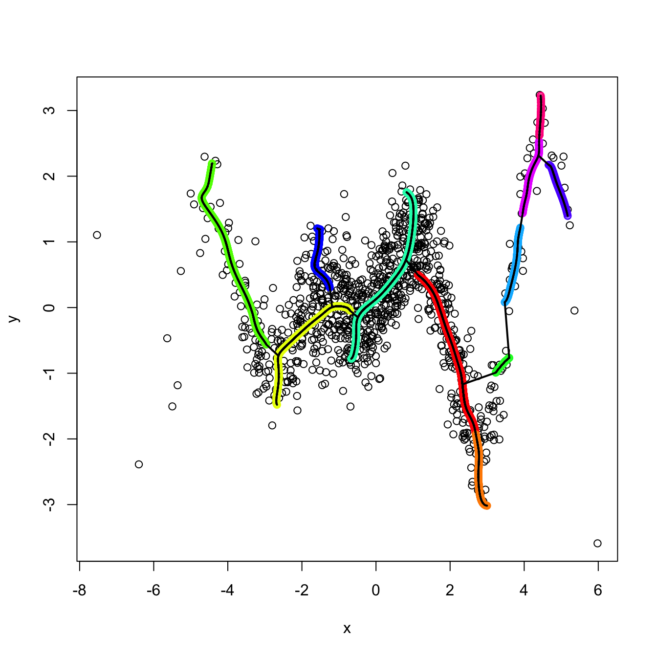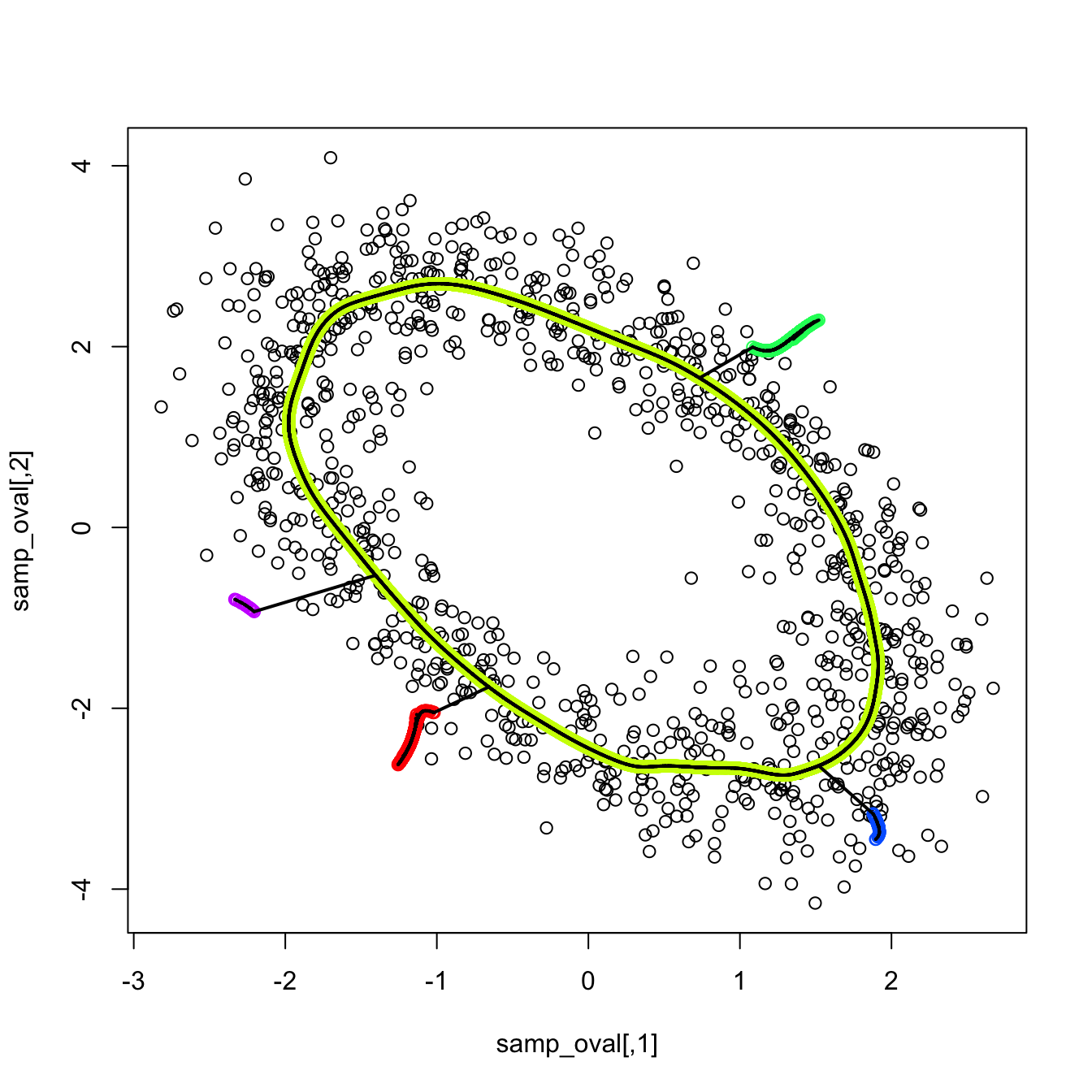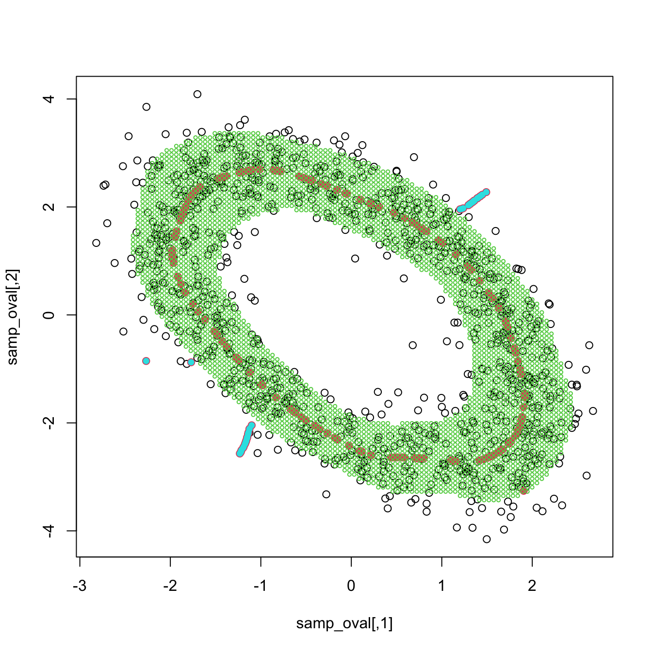 points(kdr_oval_1$end.points[out_kde, 1:2], col = 5, cex = 0.75, pch = 19)