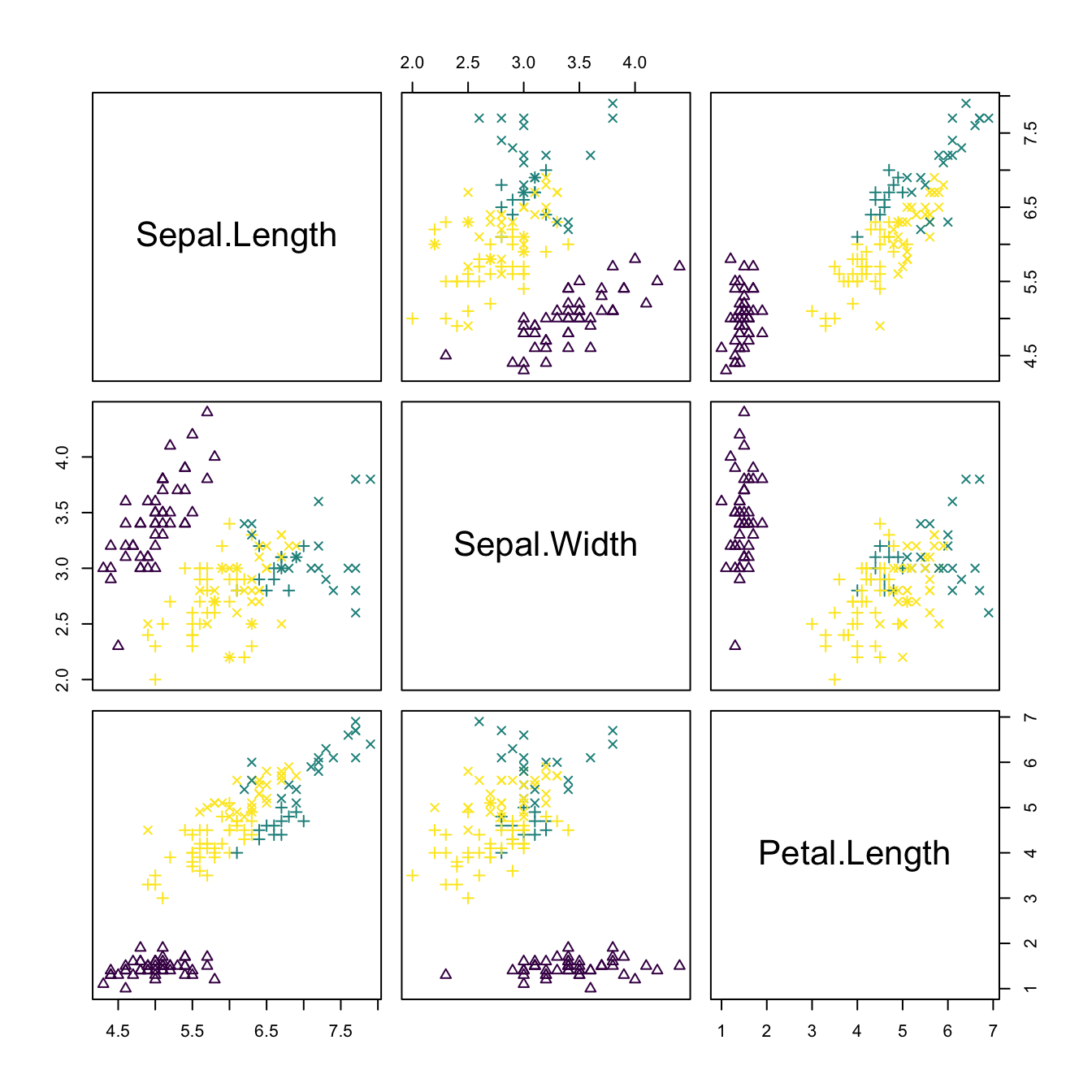 His missing,ks::kms(x)calls internallyks::Hpi(x, deriv.order = 1, nstage = 2 - (d > 2)). This is different from providing the bandwidth asH = ks::Hpi(x, deriv.order = 1)(the default inks::Hpi()isnstage = 2), making it easy to run into inconsistencies for dimensions larger than two.↩︎Observe that, since we are interested in the argument \(j\) that maximizes \(\mathbb{P}[Y=j|\mathbf{X}=\mathbf{x}],\) we do not care about the standardization by \(\sum_{j=1}^m \pi_jf_j(\mathbf{x})\) in (3.28), as this is a constant common factor for all \(j=1,\ldots,m.\)↩︎