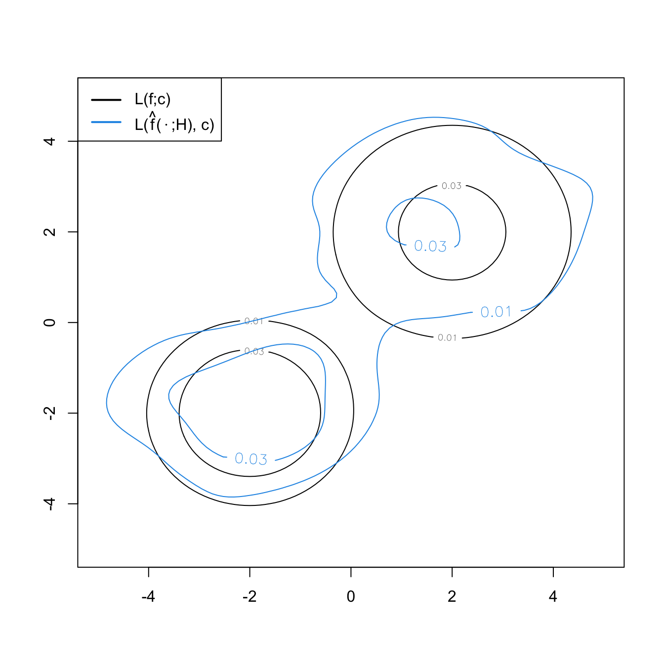 \[\begin{align*} \mathcal{L}(\hat{f}(\cdot;\mathbf{H});c) = \{\mathbf{x}\in\mathbb{R}^p:\hat{f}(\mathbf{x};\mathbf{H})\geq c\}. \end{align*}\]