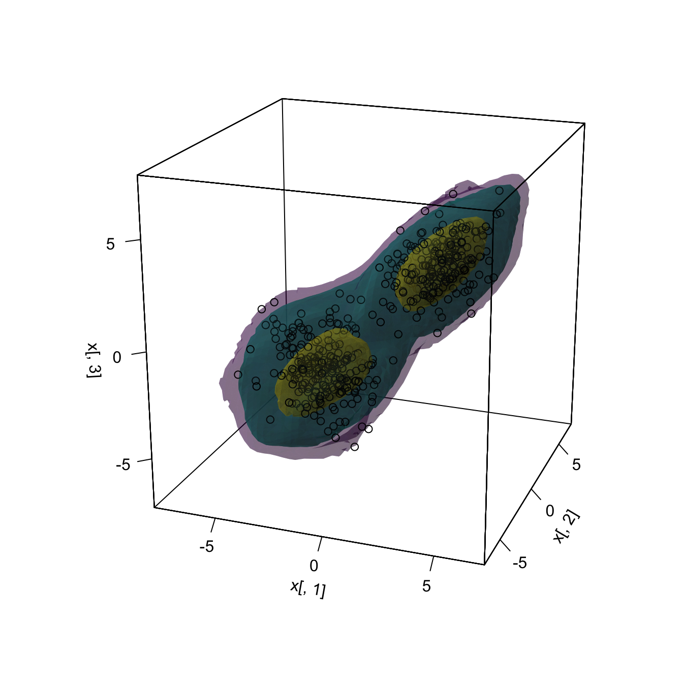Density level set estimation. The level set of the density \(f\) at level \(c\geq0\) is defined as \(\mathcal{L}(f;c):=\{\mathbf{x}\in\mathbb{R}^p: f(\mathbf{x})\geq c\}.\) An estimation of \(\mathcal{L}(f;c)\) is useful to visualize the highest density regions, which give a concise view of the most likely values for \(\mathbf{X}\) and therefore summarize the structure of \(\mathbf{X}.\) In addition, this summary is produced without needing to restrict to connected sets,76 as the box plot77 does,78 and with the additional benefit of determining the approximate probability contained in them. Level sets also are useful to estimate the support of \(\mathbf{X}\) and to detect multivariate outliers without the need to employ the Mahalanobis distance.79