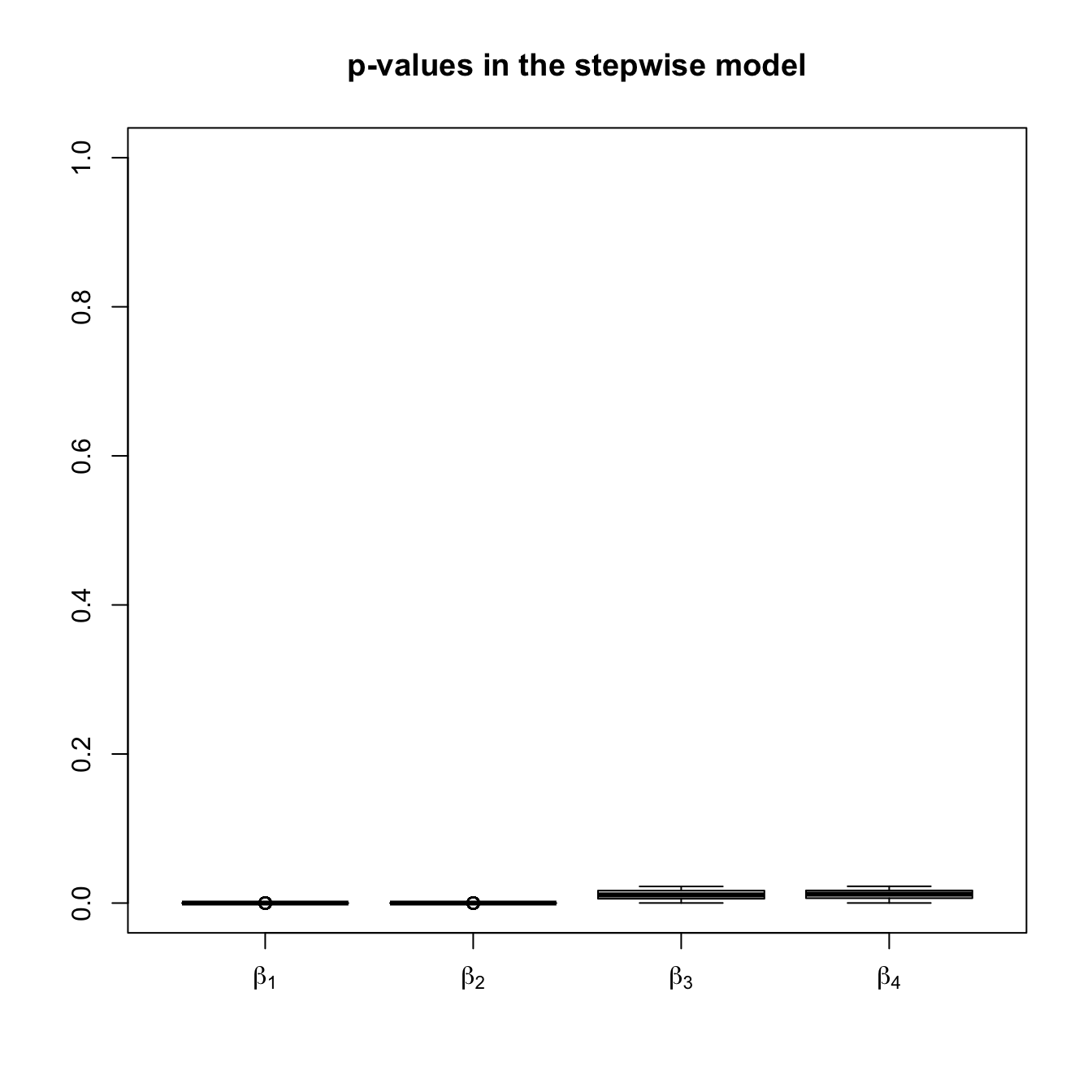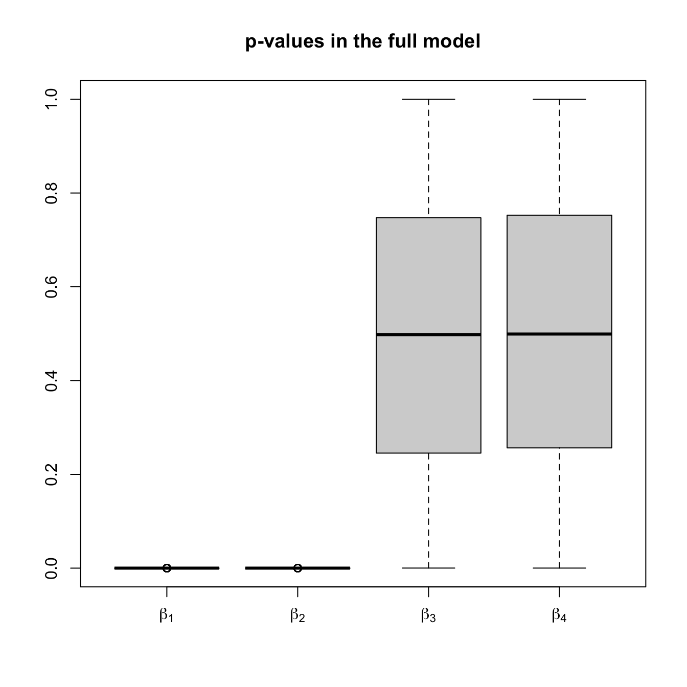 boxplot(pvalues1, names = expression(beta[1], beta[2], beta[3], beta[4]),