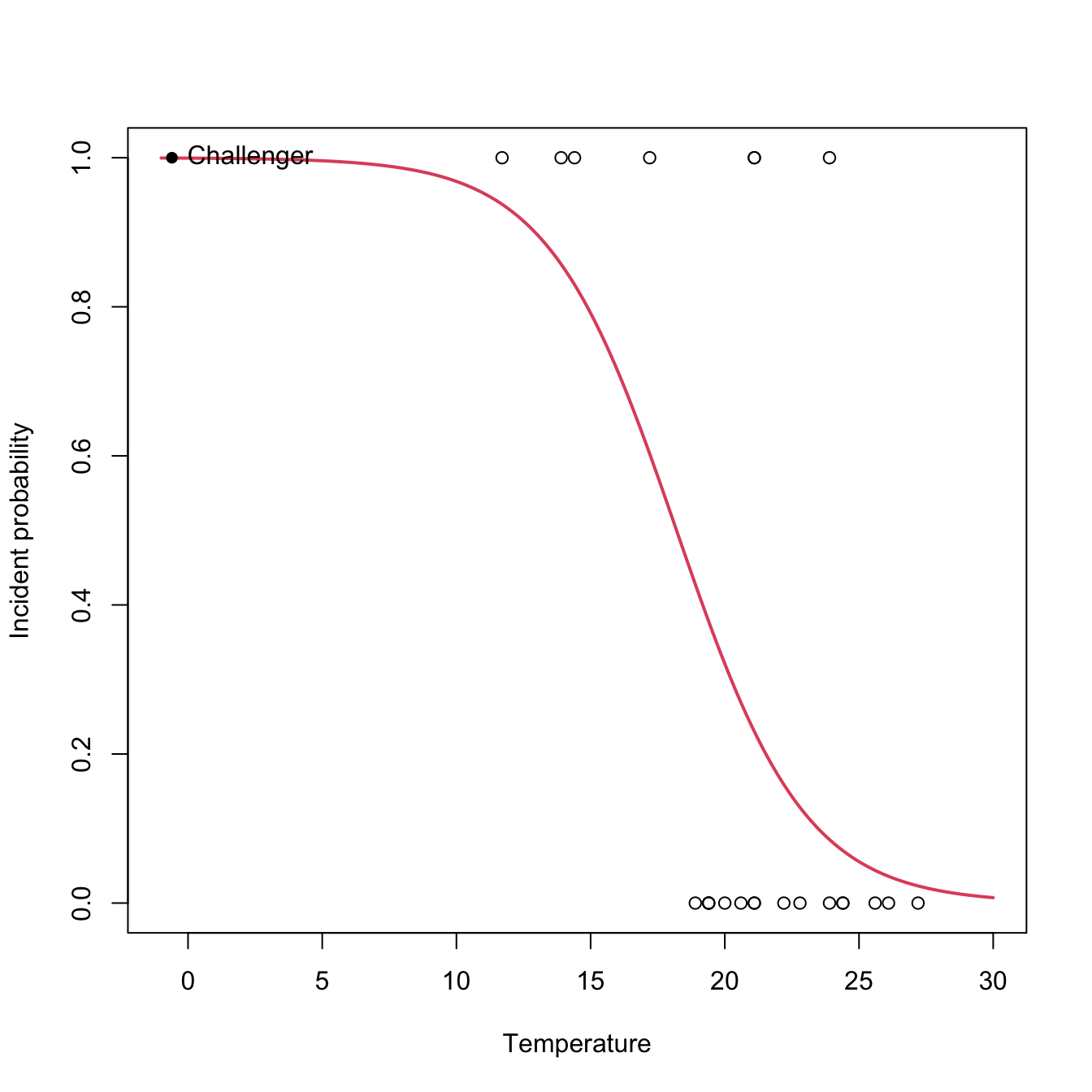 plot(challenger$temp, challenger$fail.field, xlim = c(-1, 30),