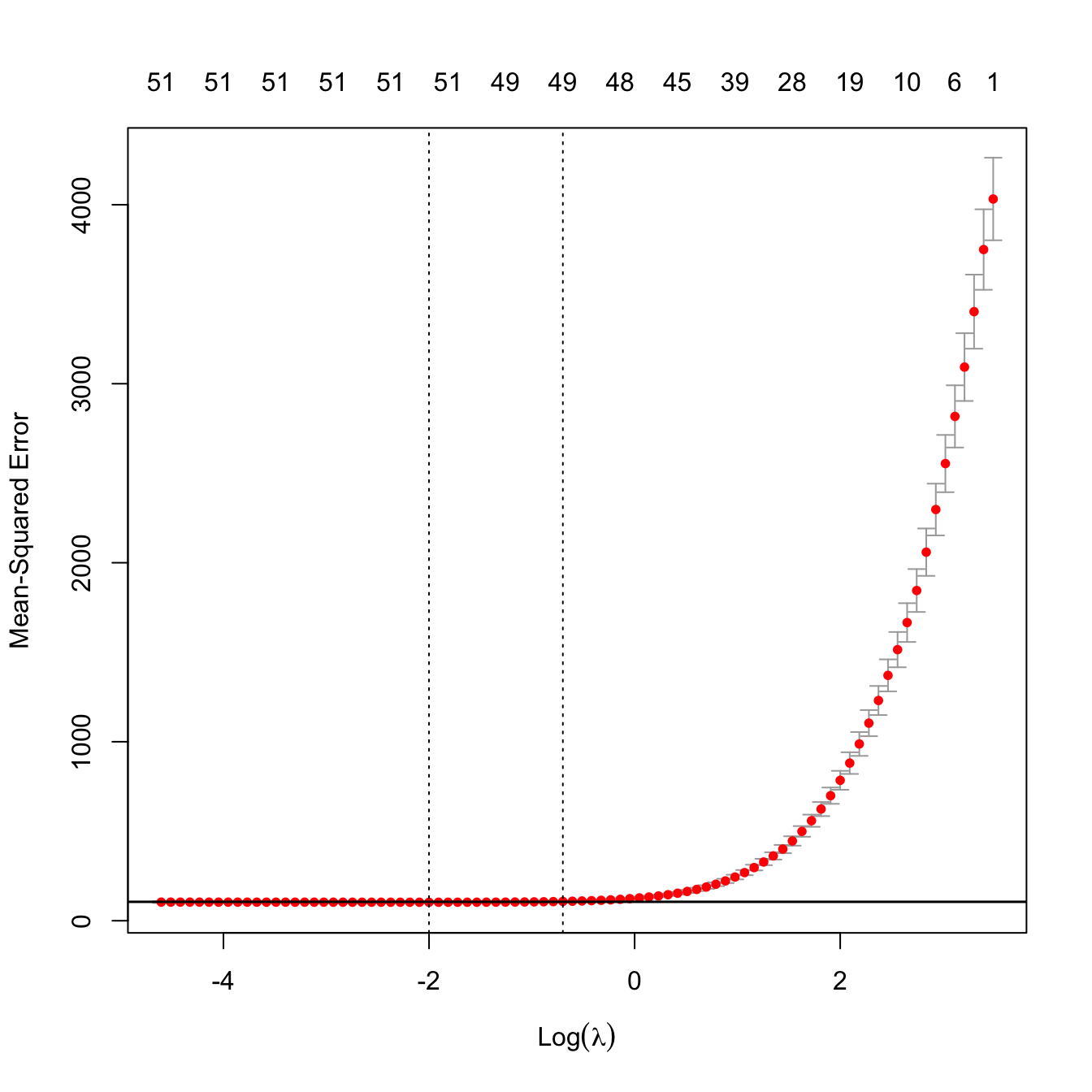 abline(h = kcvLassoM$cvm[indMin] + c(0, kcvLassoM$cvsd[indMin]))