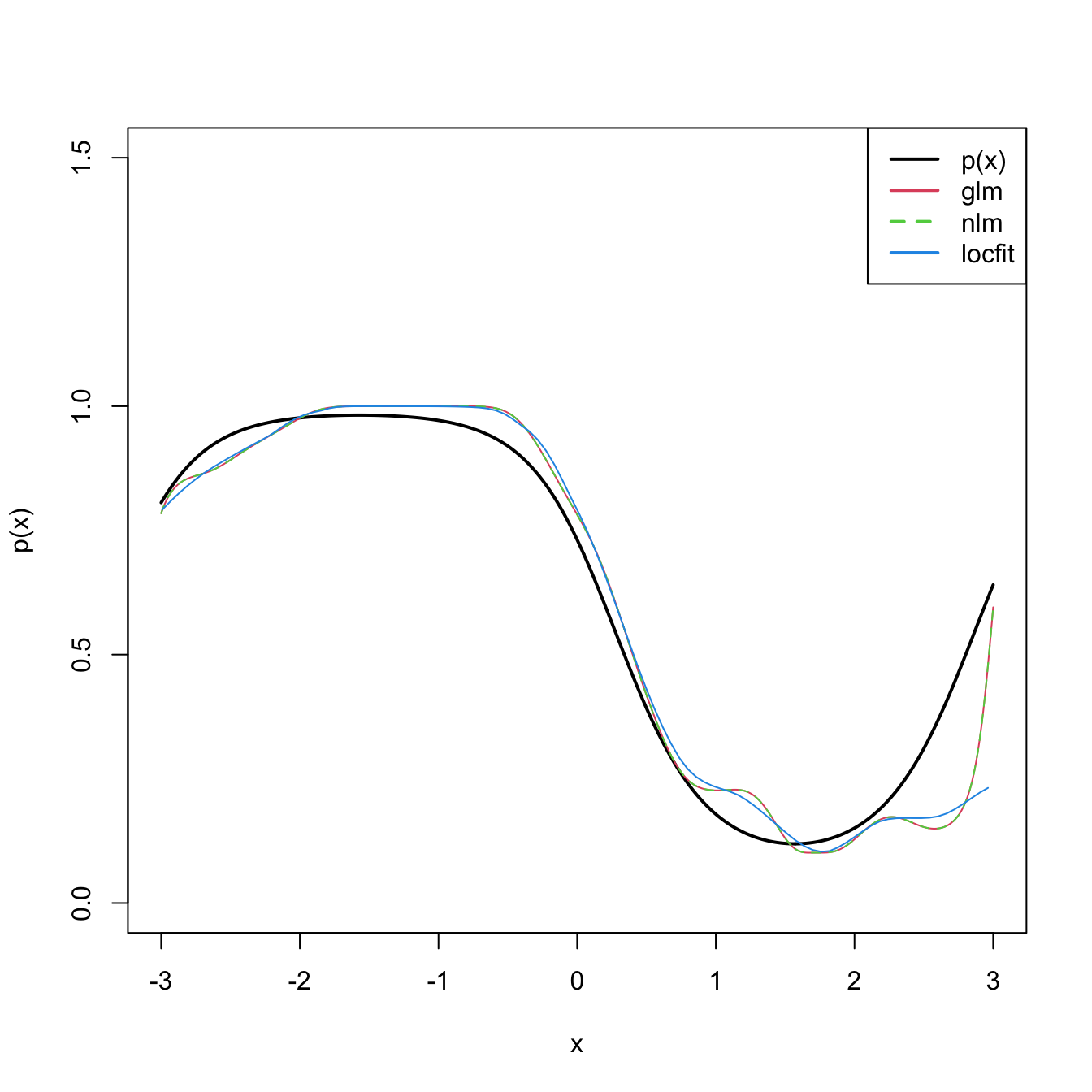 legend("topright", legend = c("p(x)", "glm", "nlm", "locfit"), lwd = 2,