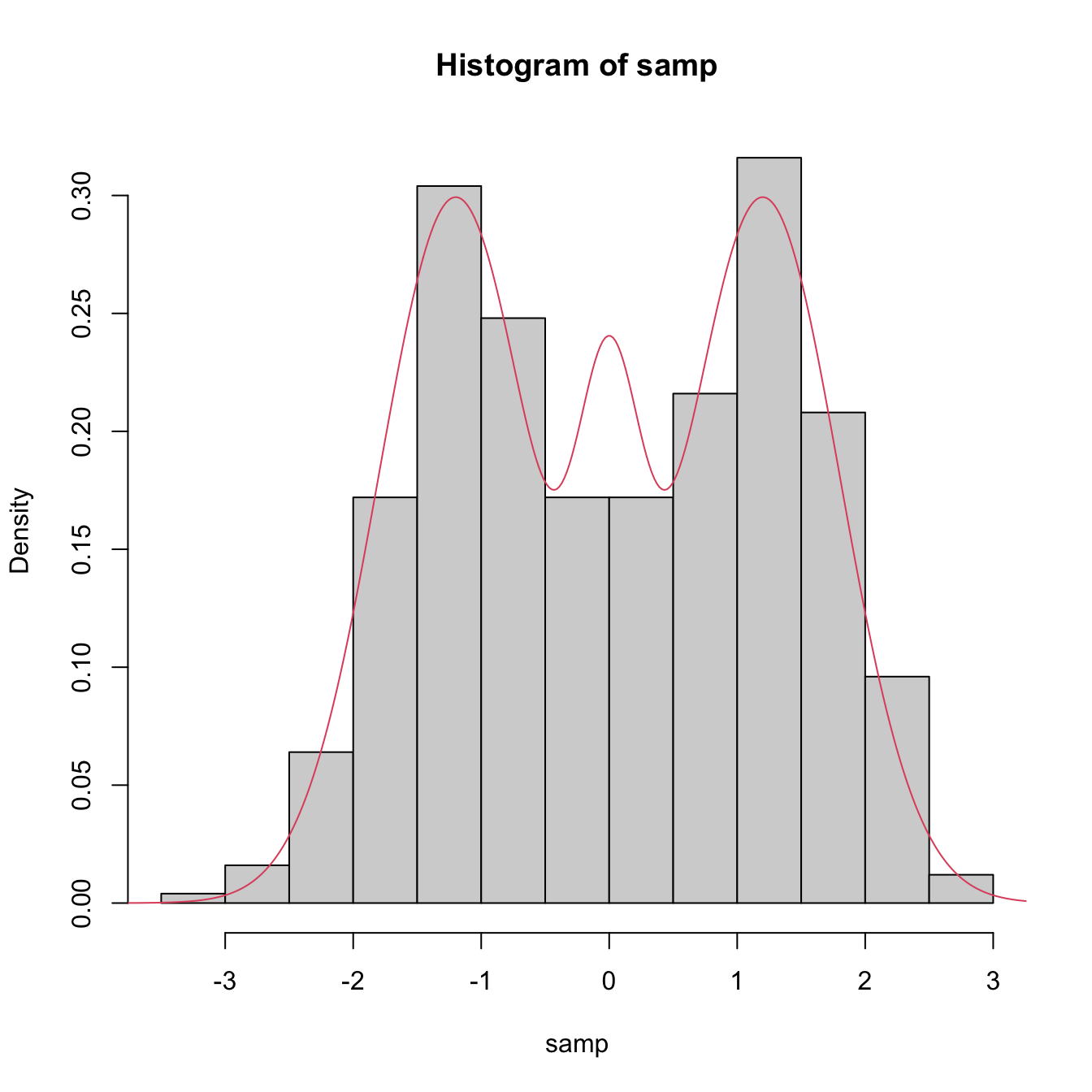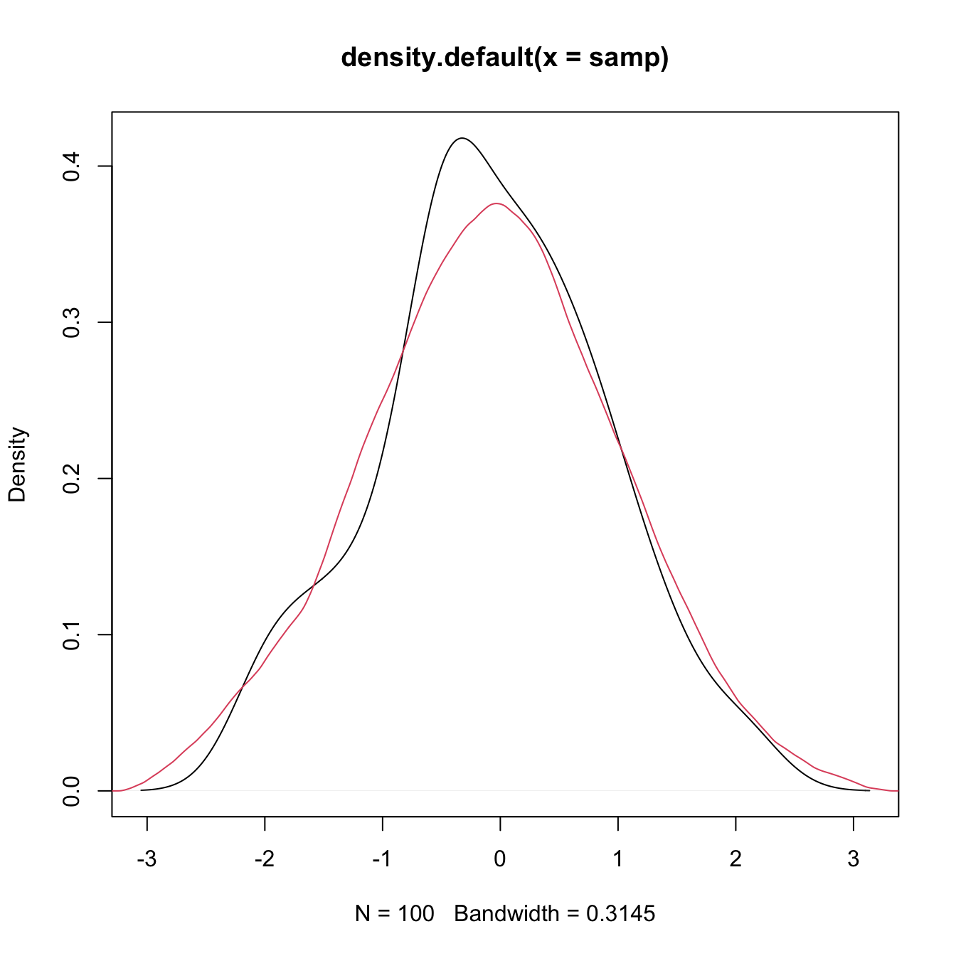 lines(density(x = samp, bw = 0.5, kernel = "epanechnikov"), col = 2)