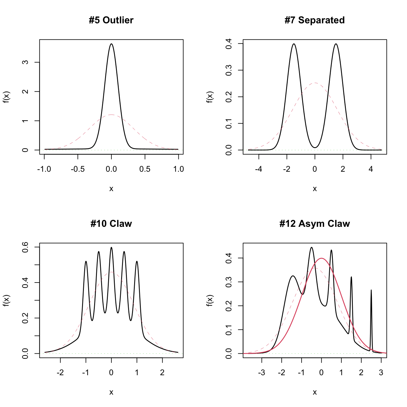 Figure 6.4 presents a visualization of the performance of the kde with different bandwidth selectors, carried out in the family of mixtures of Marron and Wand (1992).