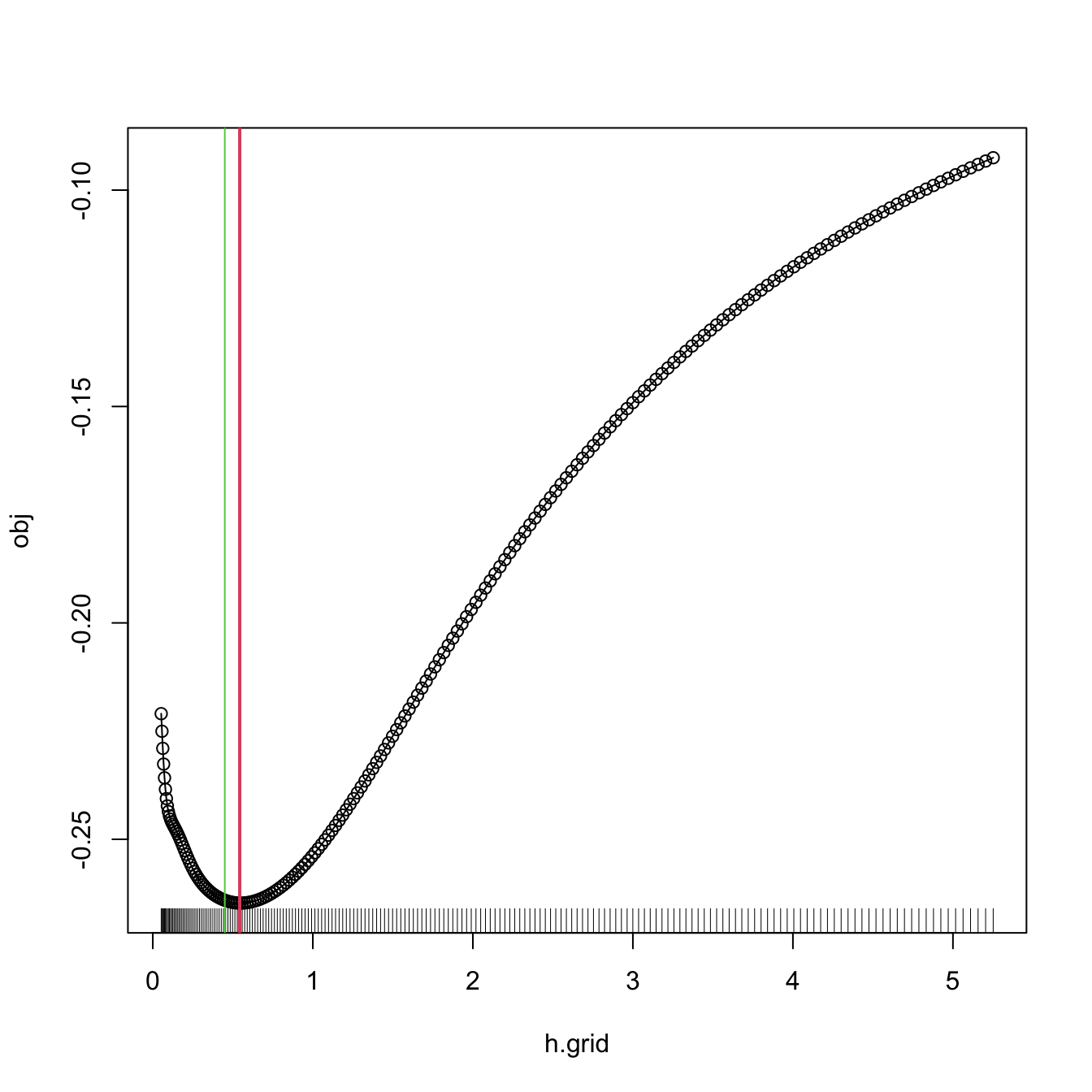 where \(\mathbf{h}=(h_1,\ldots,h_p)'\) is the vector of bandwidths. If the variables \(X_1,\ldots,X_p\) have been standardized (so that they have the same scale), then a simple choice is to consider \(h=h_1=\ldots=h_p.\)