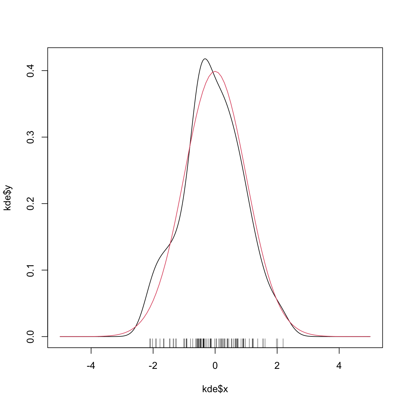 plot(density(x = samp, from = -4, to = 4), xlim = c(-5, 5))