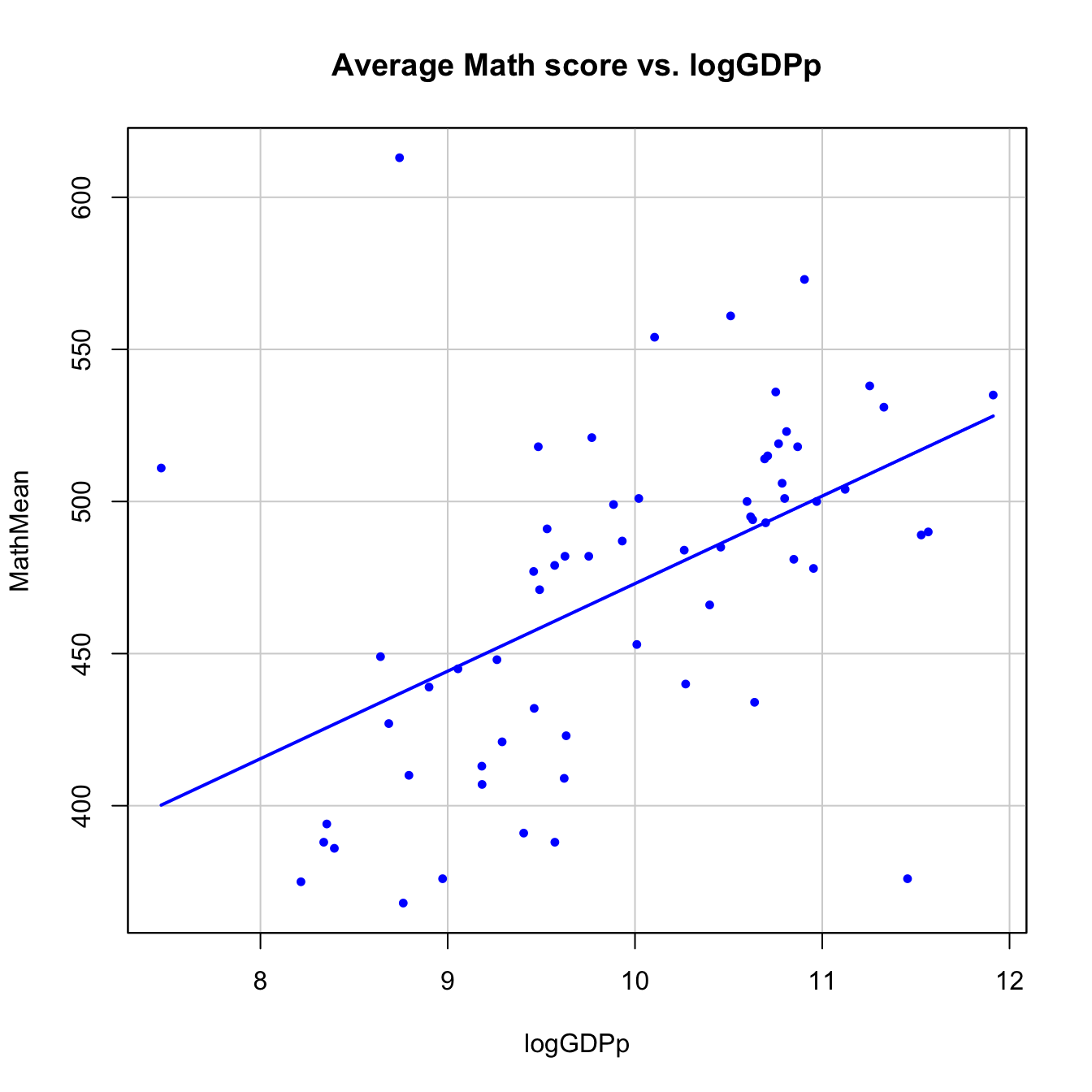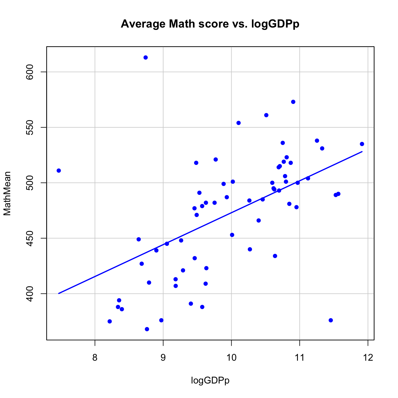 MathMeanvslogGDPp, with its corresponding regression line.scatterplot(MathMean ~ logGDPp, reg.line = lm, smooth = FALSE, spread = FALSE, id.method = 'mahal', id.n = 3, boxplots = FALSE, span = 0.5, ellipse = FALSE, levels = c(.5, .9), main = "Average Math score vs. logGDPp", pch = c(16), data = pisa)